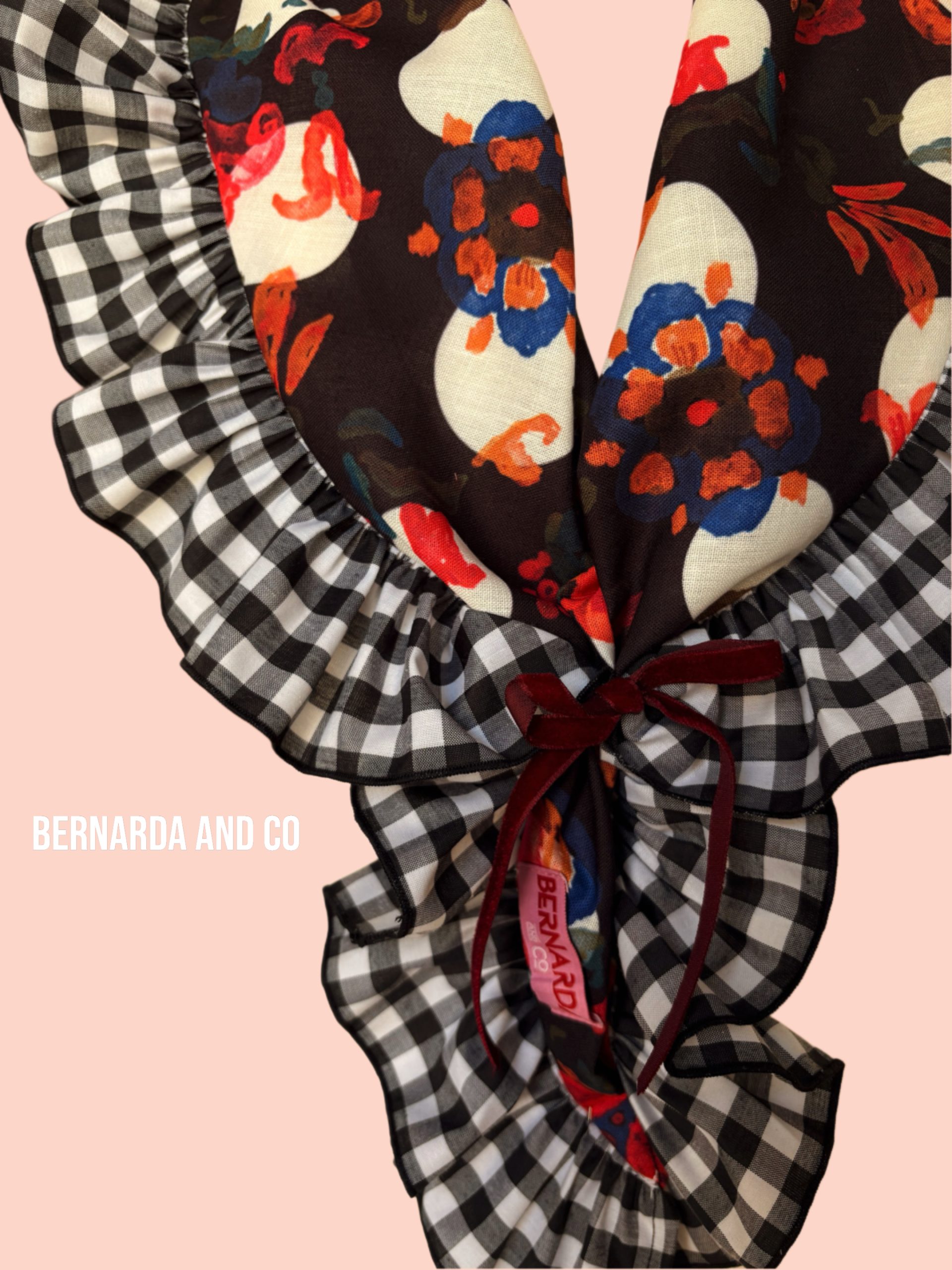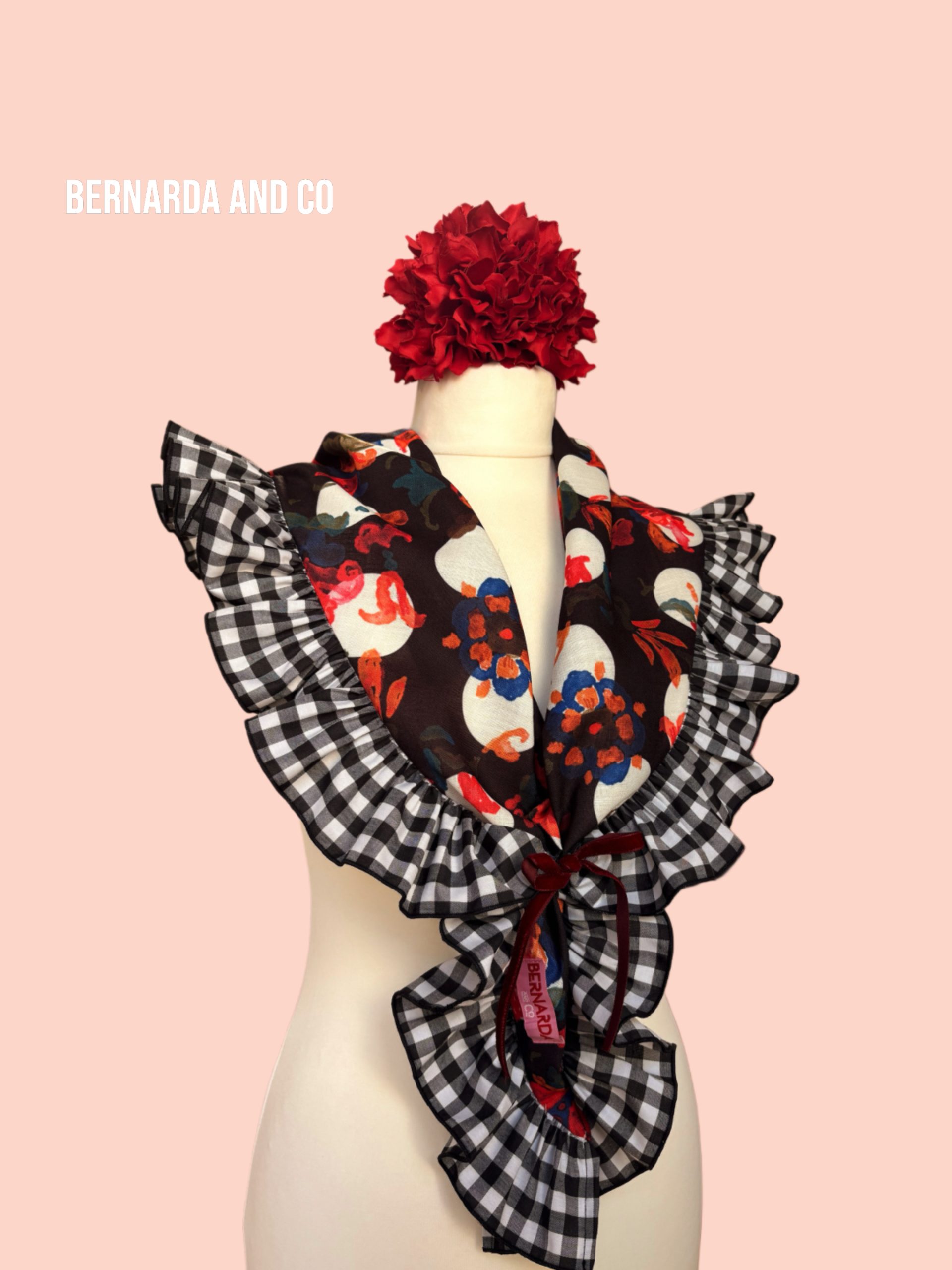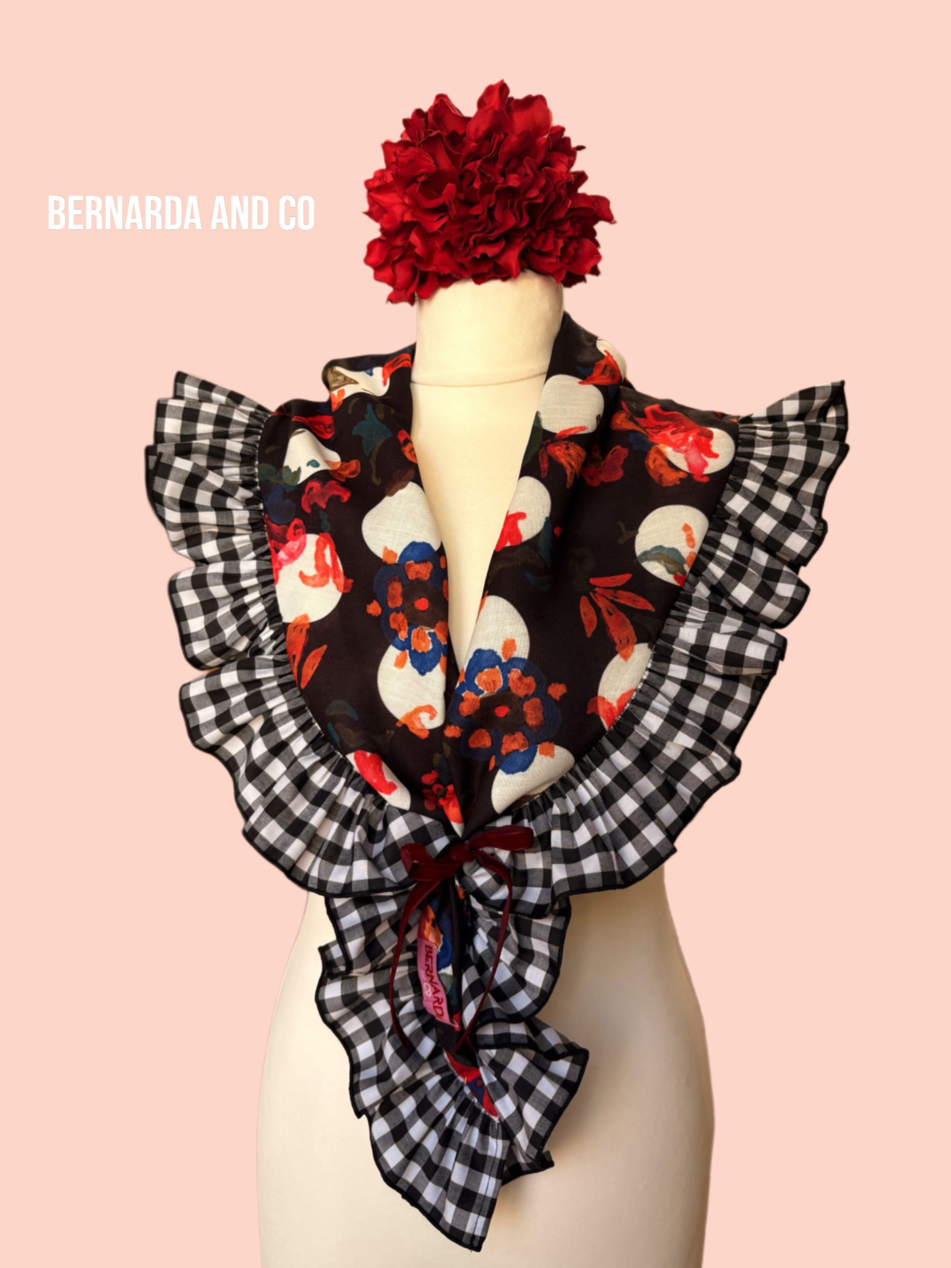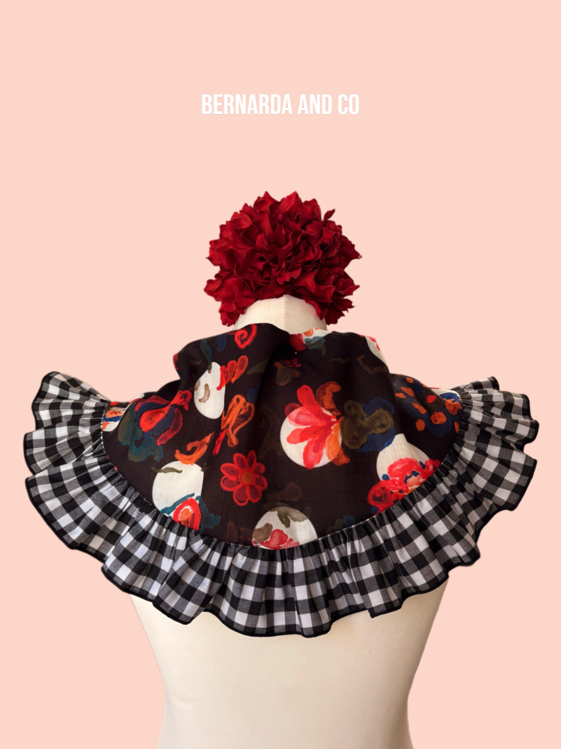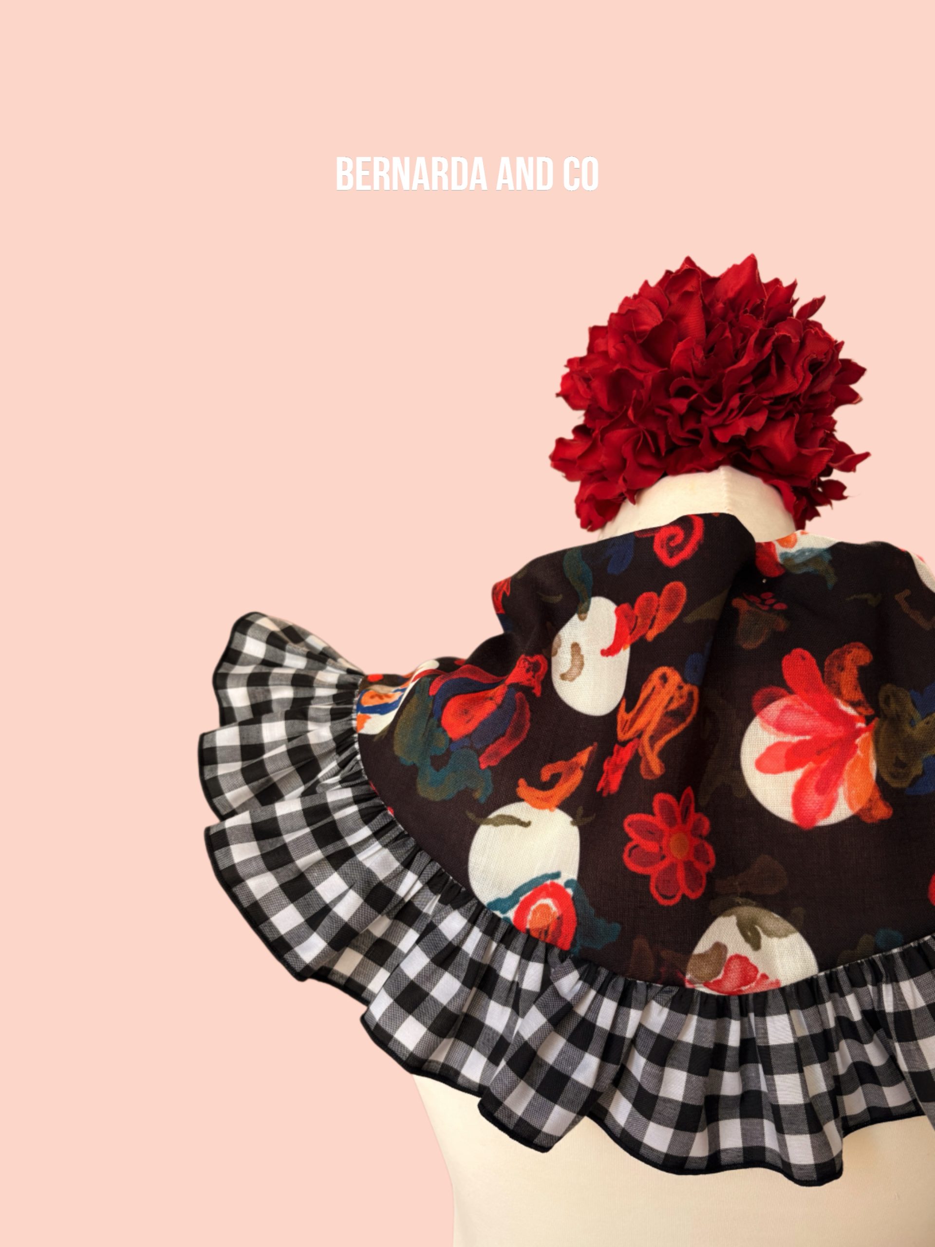 Piquillo de flamenca confeccionado en polilino con estampado de lunares y motivos florales en acuarela, decorado con volante fruncido en vichy blanco y negro.